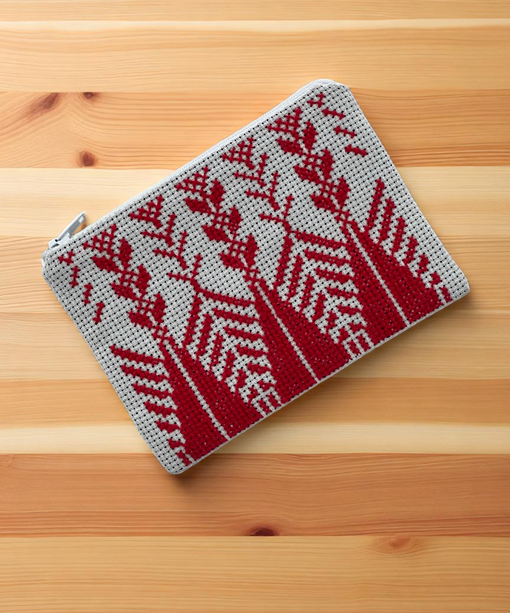Das Muster dieser Tasche ist ein authentisches "Tatreez" (traditionelle palästinensische Kreuzstichstickerei), bekannt für seine geometrischen Formen und lebendigen Farben.