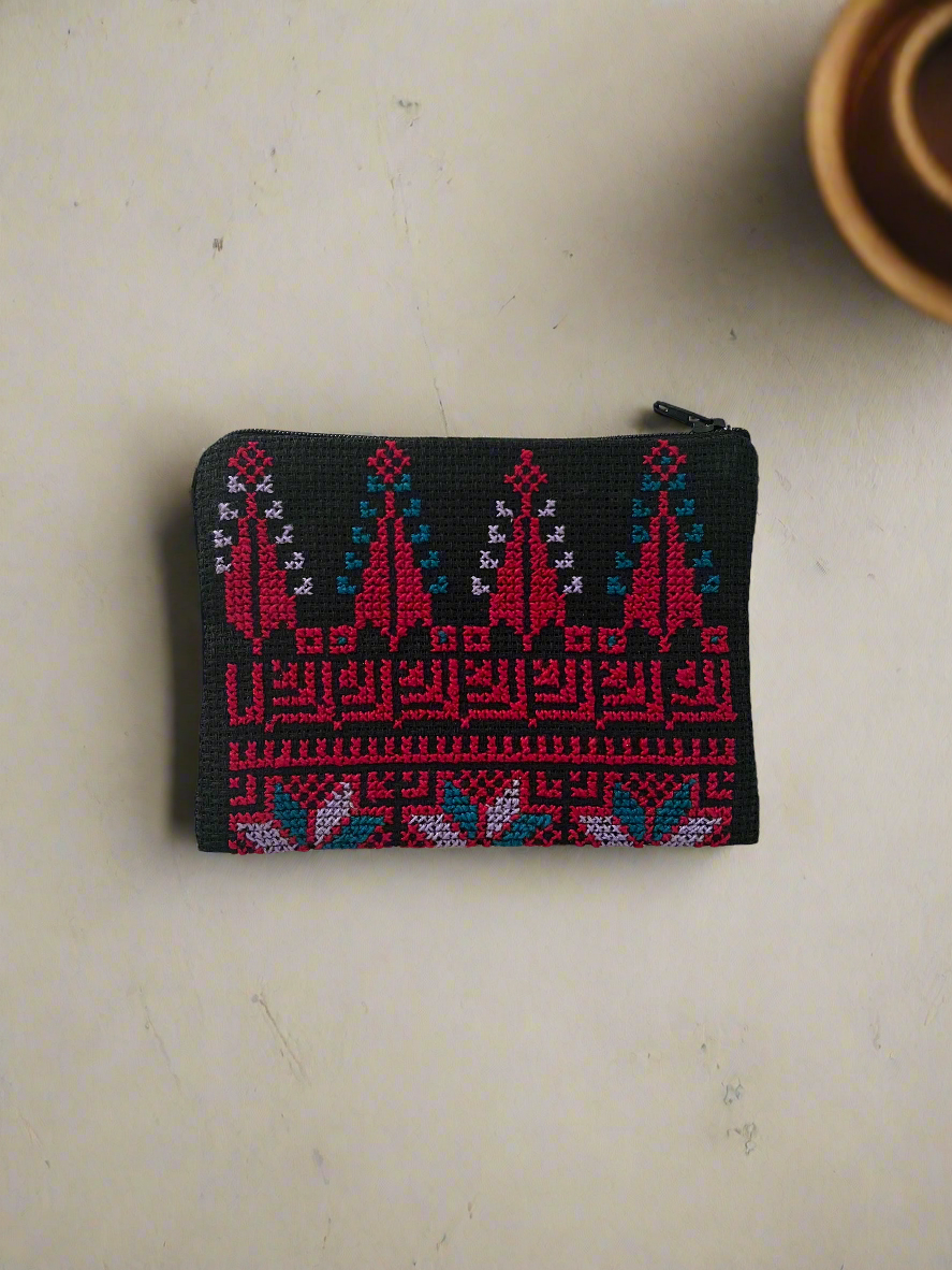 Das Muster dieser Tasche ist ein authentisches "Tatreez" (traditionelle palästinensische Kreuzstichstickerei), bekannt für seine geometrischen Formen und lebendigen Farben.