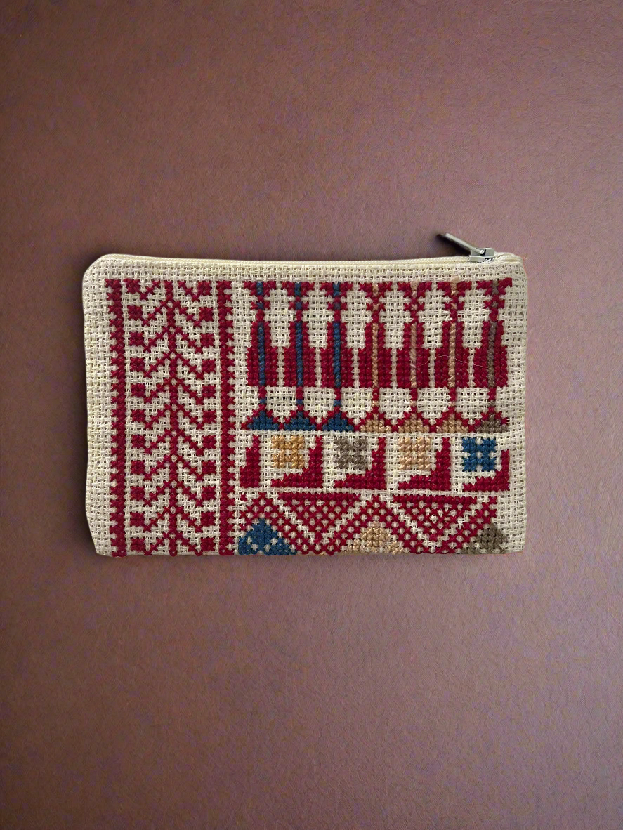 Das Muster dieser Tasche ist ein authentisches "Tatreez" (traditionelle palästinensische Kreuzstichstickerei), bekannt für seine geometrischen Formen und lebendigen Farben.
