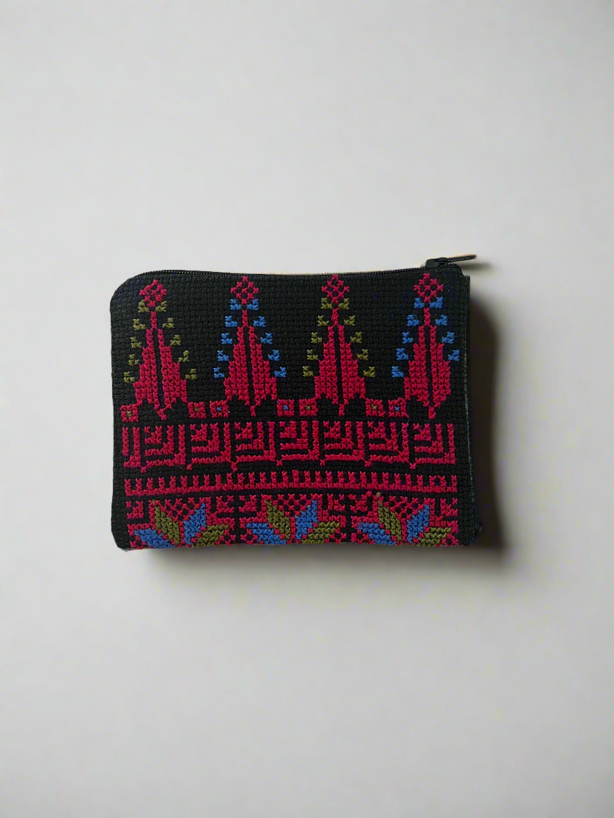 Das Muster dieser Tasche ist ein authentisches "Tatreez" (traditionelle palästinensische Kreuzstichstickerei), bekannt für seine geometrischen Formen und lebendigen Farben.
