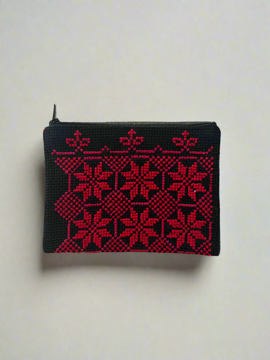 Das Muster dieser Tasche ist ein authentisches "Tatreez" (traditionelle palästinensische Kreuzstichstickerei), bekannt für seine geometrischen Formen und lebendigen Farben.
