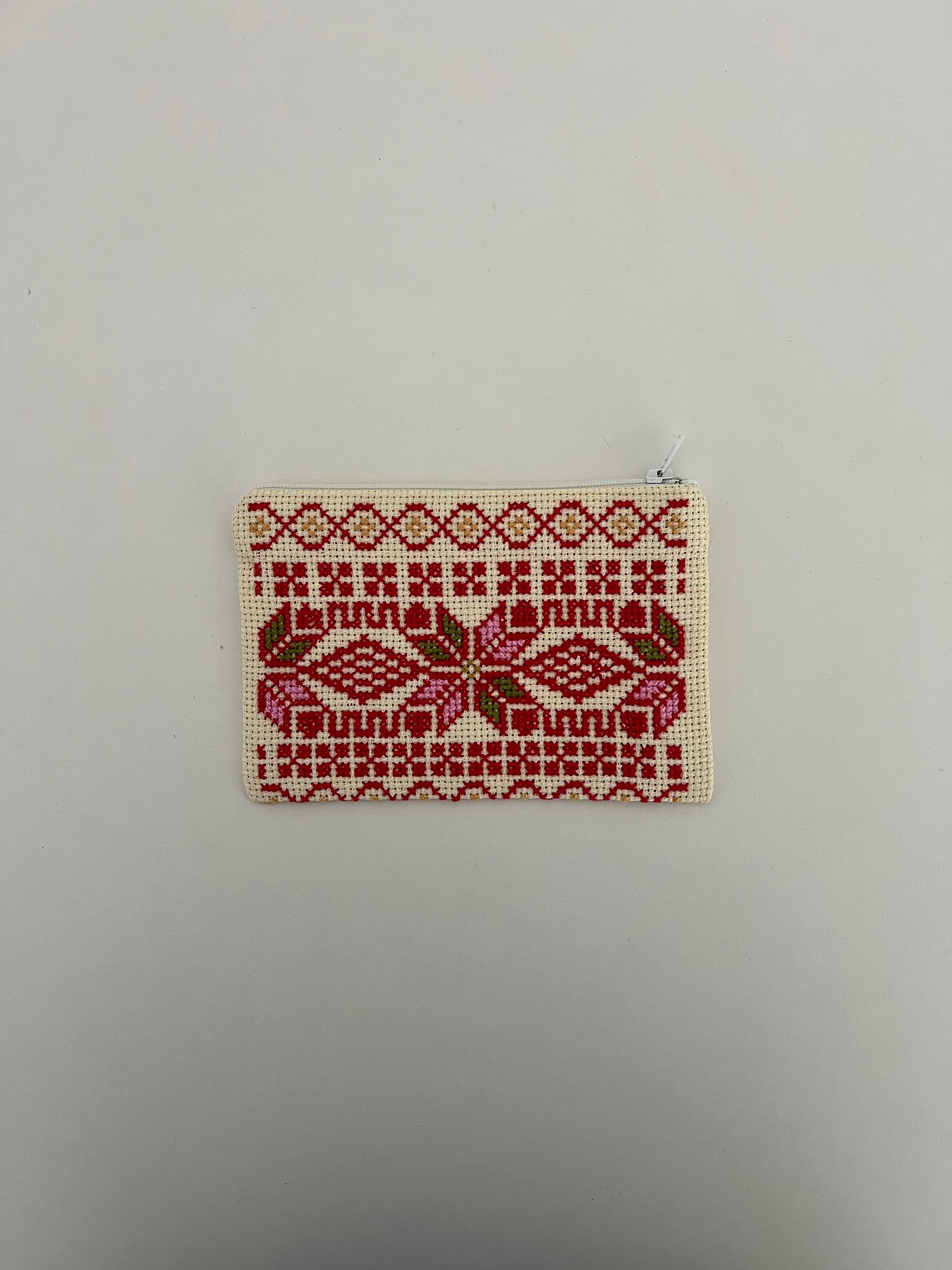 Das Muster dieser Tasche ist ein authentisches "Tatreez" (traditionelle palästinensische Kreuzstichstickerei), bekannt für seine geometrischen Formen und lebendigen Farben.
