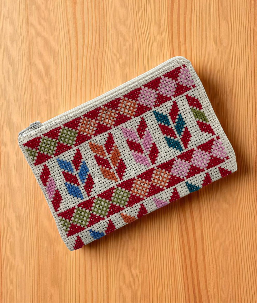 Das Muster dieser Tasche ist ein authentisches "Tatreez" (traditionelle palästinensische Kreuzstichstickerei), bekannt für seine geometrischen Formen und lebendigen Farben.