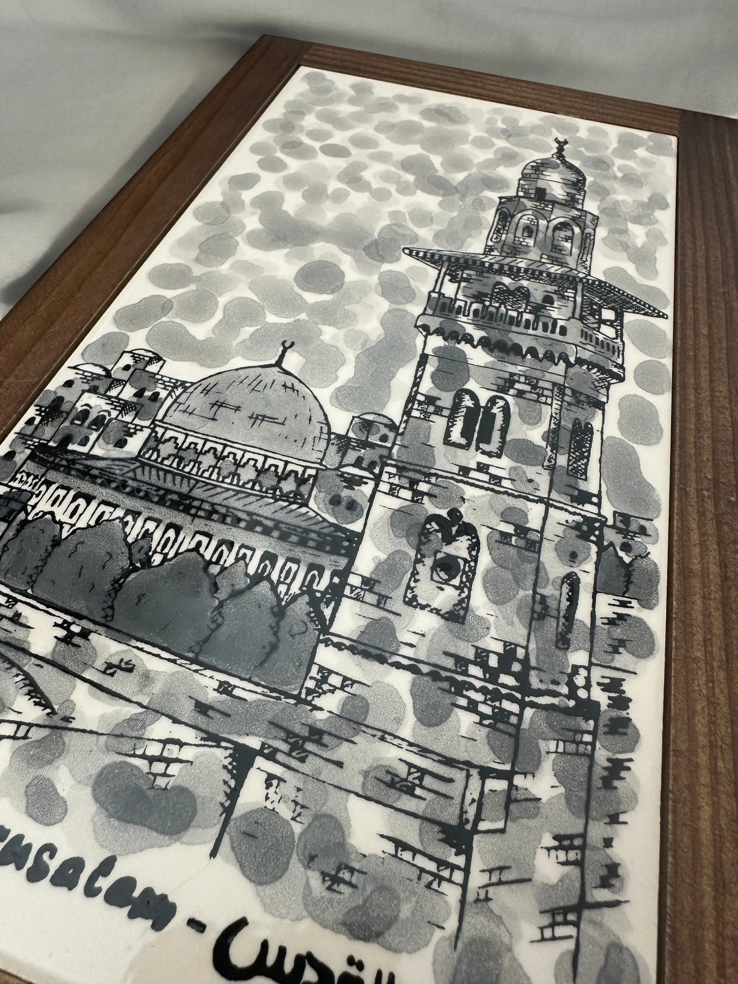 Auf dem Bild sind die Minarette der Al Aqsa zu sehen. Sie befindet sich in der Nähe des Silsilah-Tors. Sie wurde während der Mamlukenherrschaft erbaut. Die Zeichnung zeigt auch die schöne Qubbetus Sahra im Hintergrund.