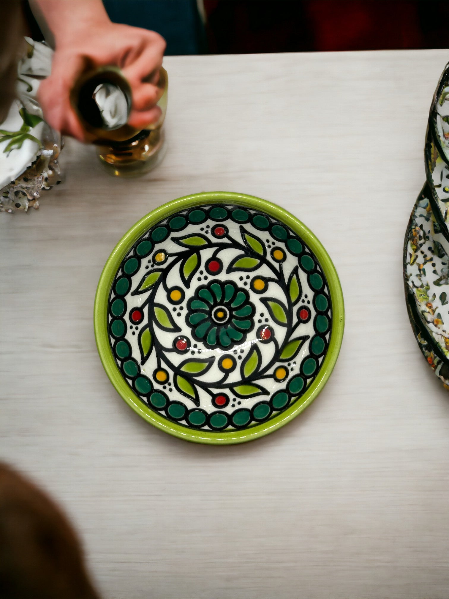 Diese bezaubernde, bauchige Schüssel verkörpert die Quintessenz der palästinensischen Keramikkunst. Das handbemalte Design zeigt ein zartes Blumenmuster in einem lebhaften Kaleidoskop aus Blau, Gelb und Rot, umrahmt von ornamentalen Akzenten auf einem frischen weißen Untergrund. Diese Schüssel ist ein Beispiel für kunstvolle Handwerkskunst und könnte vielseitig als Teil eines eleganten Tafelservices, zur Aufbewahrung kleiner Kostbarkeiten oder einfach als dekoratives Element verwendet werden. Die kompakte Größe macht sie ideal für den alltäglichen Gebrauch, während die detailreiche Bemalung jedem Raum ein Stück palästinensischer Tradition und Farbe verleiht.