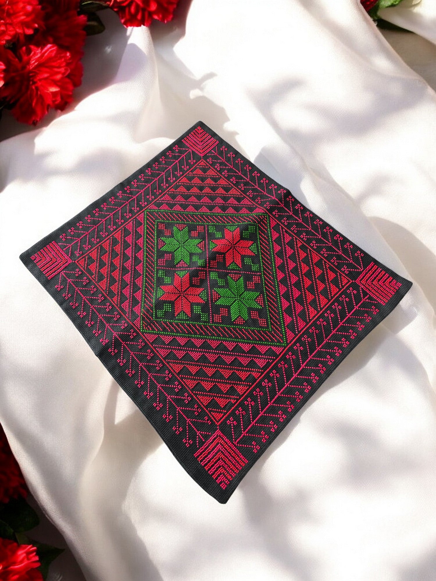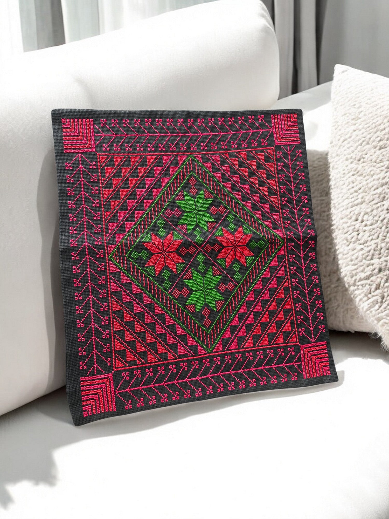 Tatreez Kissenbezug aus Palästina: Dieser wunderschöne Kissenbezug ist ein wahres Kunstwerk. Er wird von talentierten Kunsthandwerkern in Palästina handgefertigt und besticht durch seine leuchtenden Farben und faszinierenden Muster. Jeder Kissenbezug erzählt eine einzigartige Geschichte und ist Ausdruck der reichen palästinensischen Kultur und Tradition der Tatreez-Stickerei. Dieser Kissenbezug verleiht Ihrem Zuhause einen Hauch von Eleganz und ist gleichzeitig ein Symbol Ihrer Wertschätzung für handgefertigte Kunst aus Palästina. Verschönern Sie Ihr Zuhause mit diesem einzigartigen Kissenbezug und tauchen Sie ein in die faszinierende Welt des Tatreez-Handwerks.
